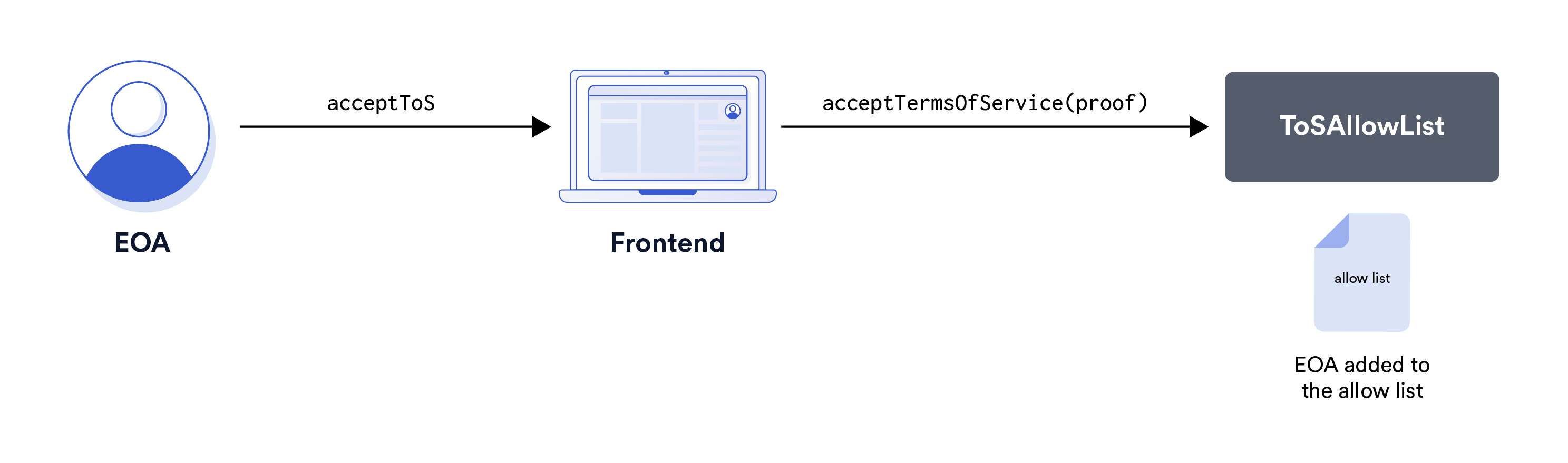 The acceptance process is initiated via the Chainlink Functions Subscription Manager. After a user accepts the ToS by generating the required signature with their externally owned account (EOA), they transmit proof of acceptance to the TermsOfServiceAllowList contract. Upon successful validation of the proof, the EOA is added to the allowedSenders