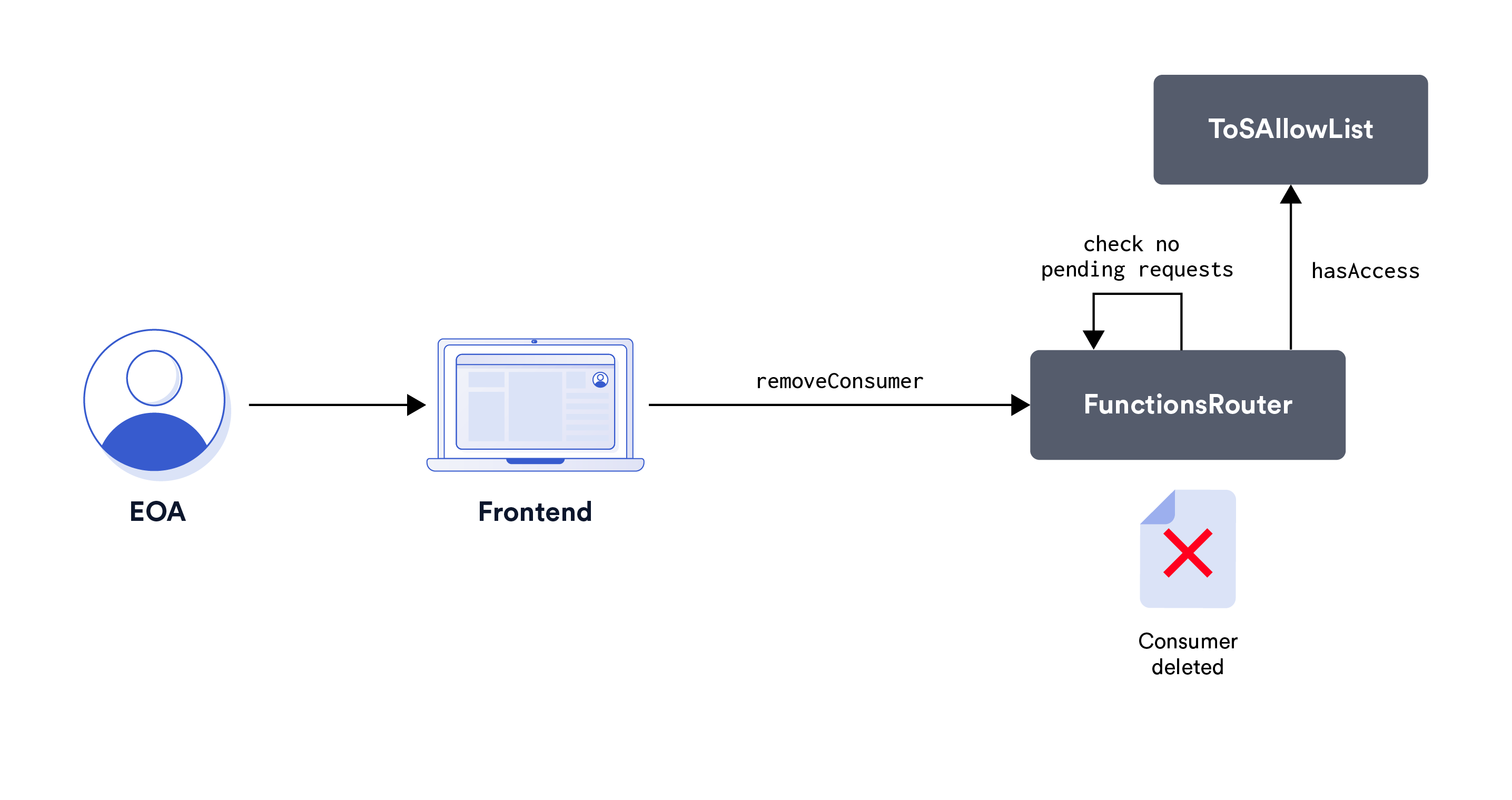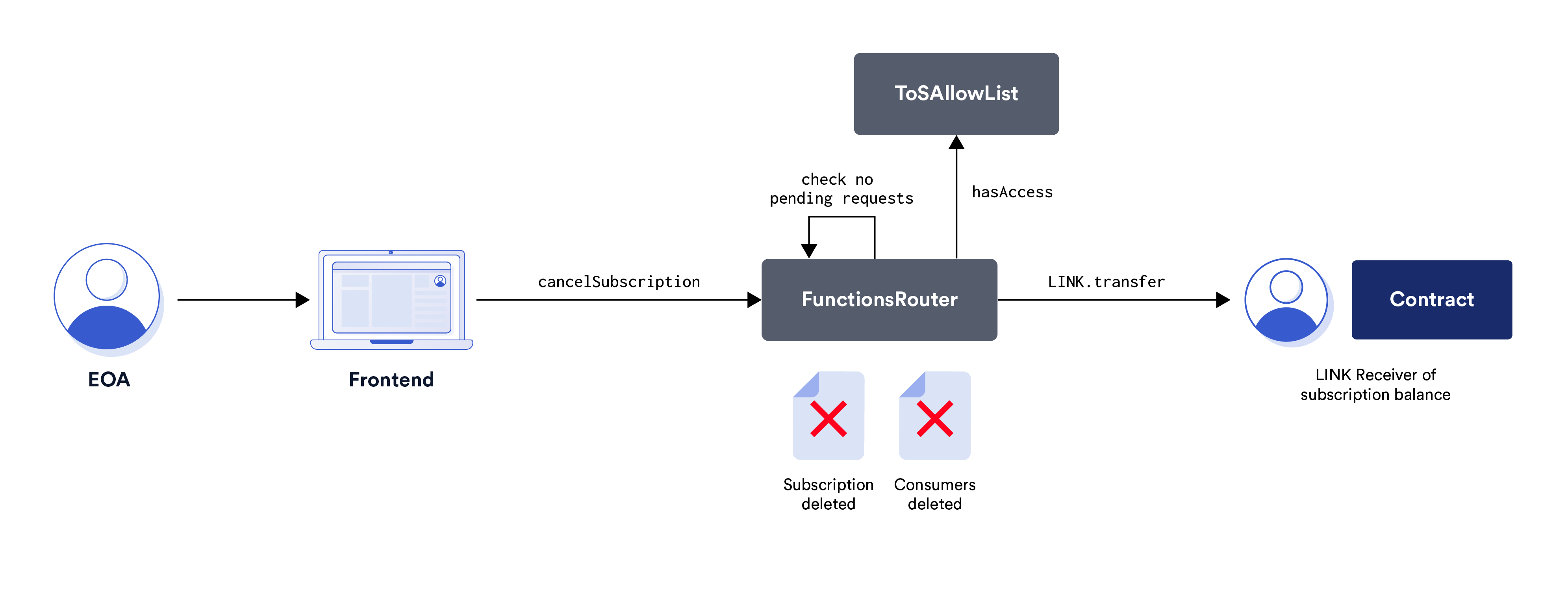 - The Chainlink Functions Subscription Manager communicates with the FunctionsRouter contract to remove the consumer contract address from the subscription account.