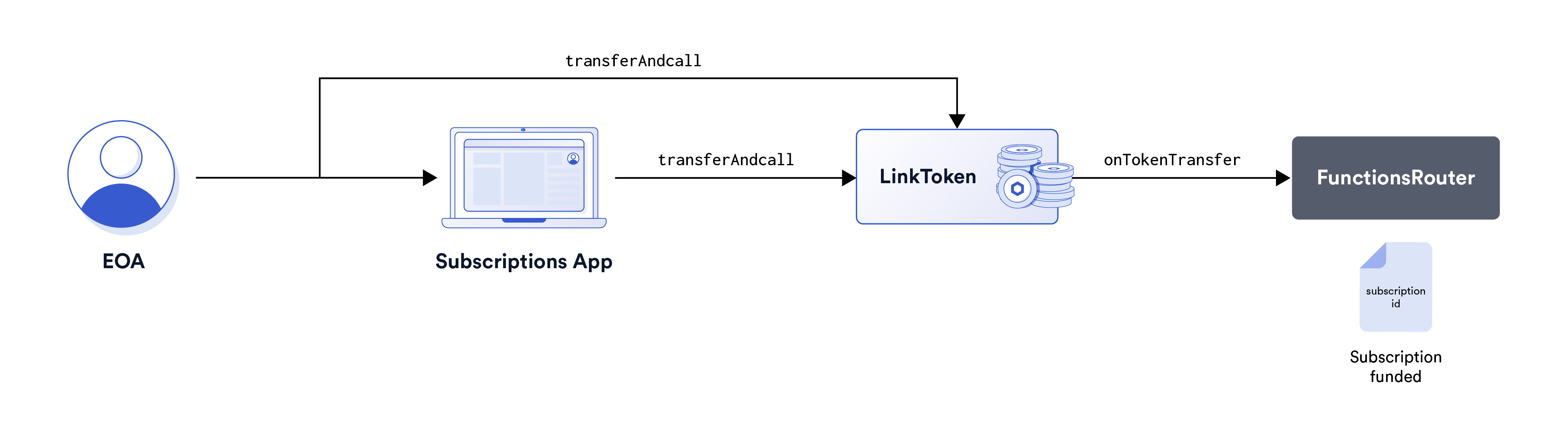 on the LINK token contract, transferring LINK tokens along with the Subscription ID in the payload. - The FunctionsRouter contract implements